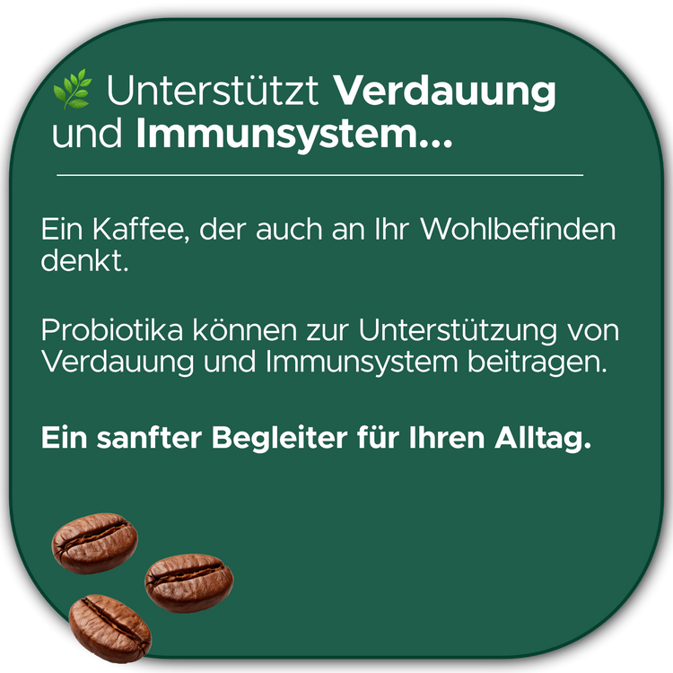 Ein ausgewogener Kaffee mit lebenden Probiotika â entwickelt fĂŒr den tĂ€glichen Genuss und Ihr Wohlbefinden.